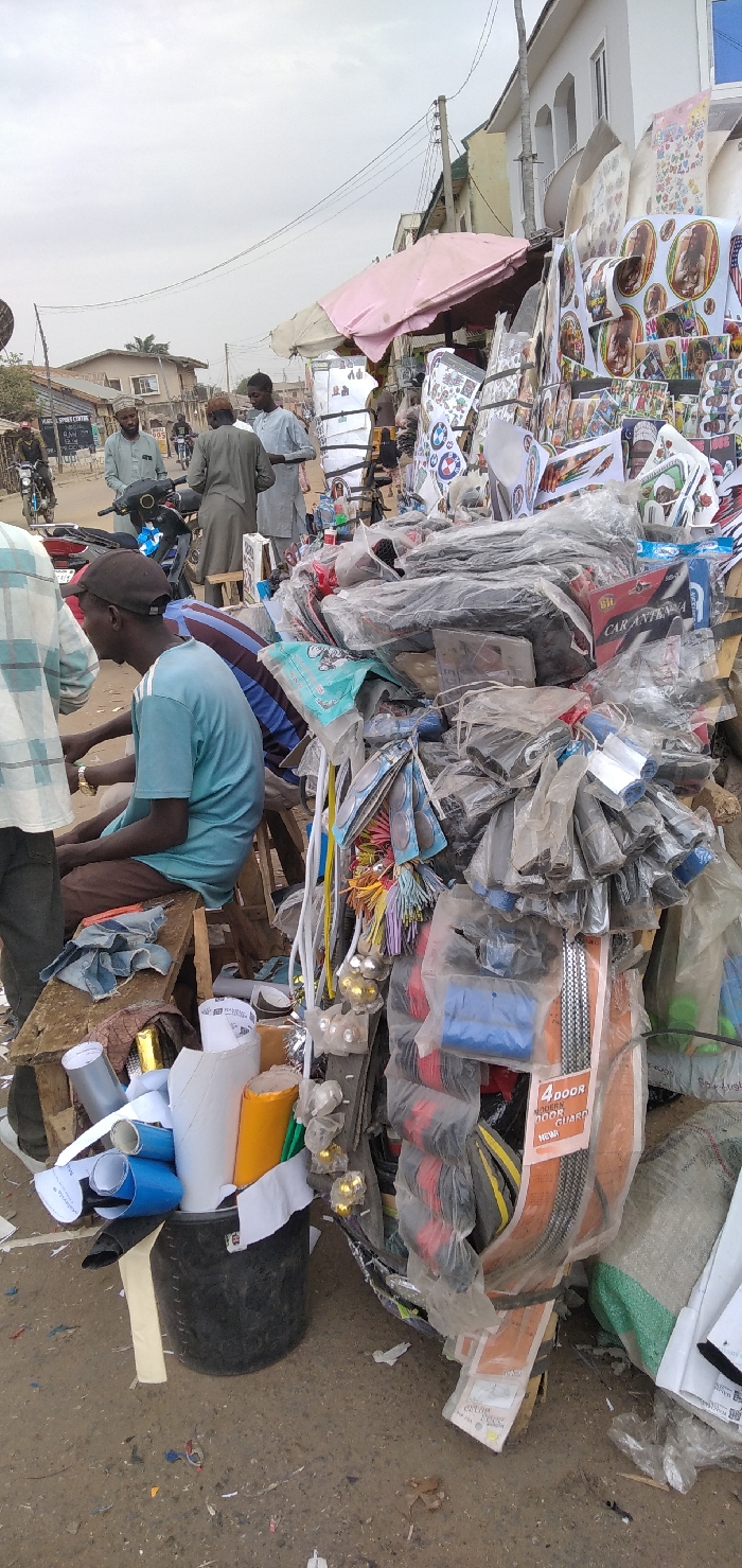 - "A bustling street scene showcases a vendor surrounded by an array of goods, including rolls of vinyl, car antennas, and 4-door guard kits" by FM-Vamwy2, licensed under CC BY 4.0