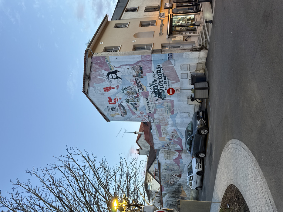 This image depicts an urban street corner in Palaiseau, France, specifically at the intersection of Rue de Paris and Rue du 11 Novembre 1918, viewed under a clear, light blue sky with a faint contrail visible in the upper right. A multi-story building dominates the right side of the frame. Its left-facing facade, and an attached lower wall extending leftward, are entirely covered by an elaborate mural. The mural features various stylized figures, banners, and text, including phrases like "LE PEUPLE" and "VICTOIRE sur la misère," and symbols of social and political protest, such as raised fists and images reminiscent of May 1968 French student protests. The adjacent right facade of this building is a light beige color, presenting multiple windows with white frames; its ground floor accommodates commercial establishments, one identifiable as "LE MONDE SOLIDAIRE" and another as "AVEN." To the left and rear of the mural wall, several other residential or commercial buildings are visible, characterized by tiled roofs. In the immediate foreground on the left, a deciduous tree with bare branches stands next to a lit street lamp emitting a yellow glow. On the asphalt street directly in front of the mural, two passenger vehicles are parked: a white 3-door hatchback and a dark gray compact SUV (Volkswagen T-Roc). A circular red 'no entry' sign with a white horizontal bar is mounted on the mural wall near the building corner, beneath which a smaller white sign reads "SAUF" (except) followed by a bicycle icon. A blue street sign, partially obscured, is affixed to the mural wall, reading "RUE DE PARIS." Two dark gray rectangular planters or bins and a bicycle are positioned on the sidewalk near the corner. A curved, gray-paved sidewalk with brick edging defines the foreground.