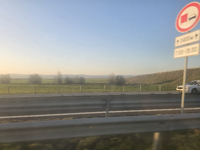 The image depicts a rural roadside scene near Загорци, Bulgaria, under a clear sky with a low sun, indicating either early morning or late afternoon. In the immediate foreground, a metallic guardrail is partially visible, suggesting the perspective is from a moving vehicle. Below the guardrail, a narrow strip of green grass is present. The midground features a paved two-lane road with a solid white shoulder line and a broken white lane divider, leading into the distance. A white sedan is partially visible on the right side of the road, appearing to move from right to left. Adjacent to the road, on the right, a gray pole supports three traffic signs: a circular "No Overtaking for Trucks" sign at the top, followed by two rectangular informational signs indicating "↑ 24.00" and "7.00 - 19.00." Beyond the road, an expansive green field stretches horizontally, bordered by a wooden post fence. Scattered bare deciduous bushes or small trees are visible across this field. To the far right, a grassy embankment slopes upward. The background consists of distant, low-lying hills under a gradient sky, transitioning from pale blue at the zenith to a soft yellow-orange near the horizon. No people are visible.