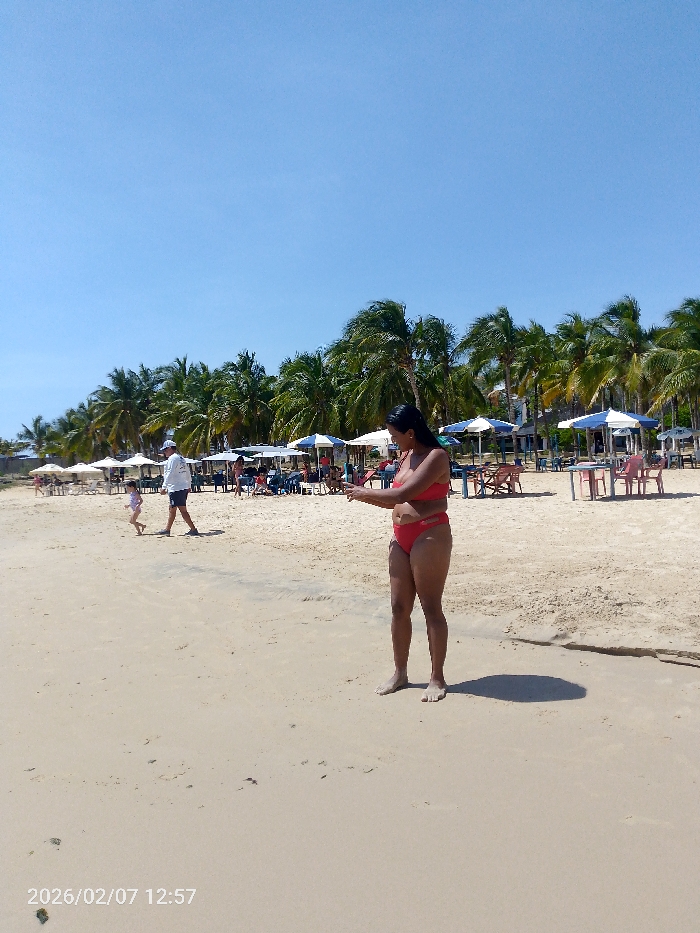 A sunny beach scene showcases a woman in a red bikini standing on tan sand. Behind her, rows of palm trees provide a tropical backdrop. Beach umbrellas and scattered beachgoers populate the scene. A man and a small child are visible to the left. The date "2026/02/07 12:57" is faintly printed at the bottom left corner.