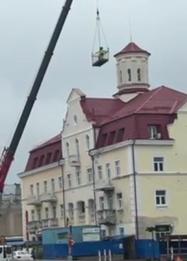 A red and gray crane is lifting a square platform containing a worker wearing a yellow safety vest into the air. The crane is located near a light yellow building with a red roof and a small tower. The building has several windows and balconies. There are some traffic barriers near the building and cars are visible in the foreground. The sky is overcast.