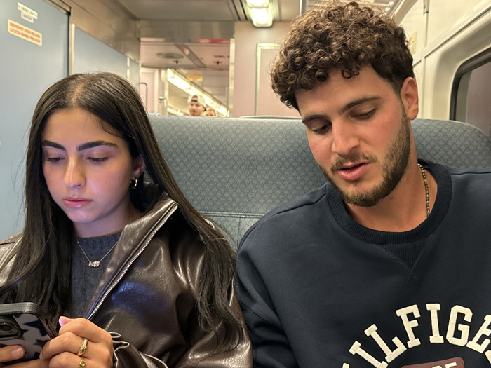 - "The scene depicts two young adult individuals seated inside a commuter train car" by FM-6nxPk2, licensed under CC BY 4.0