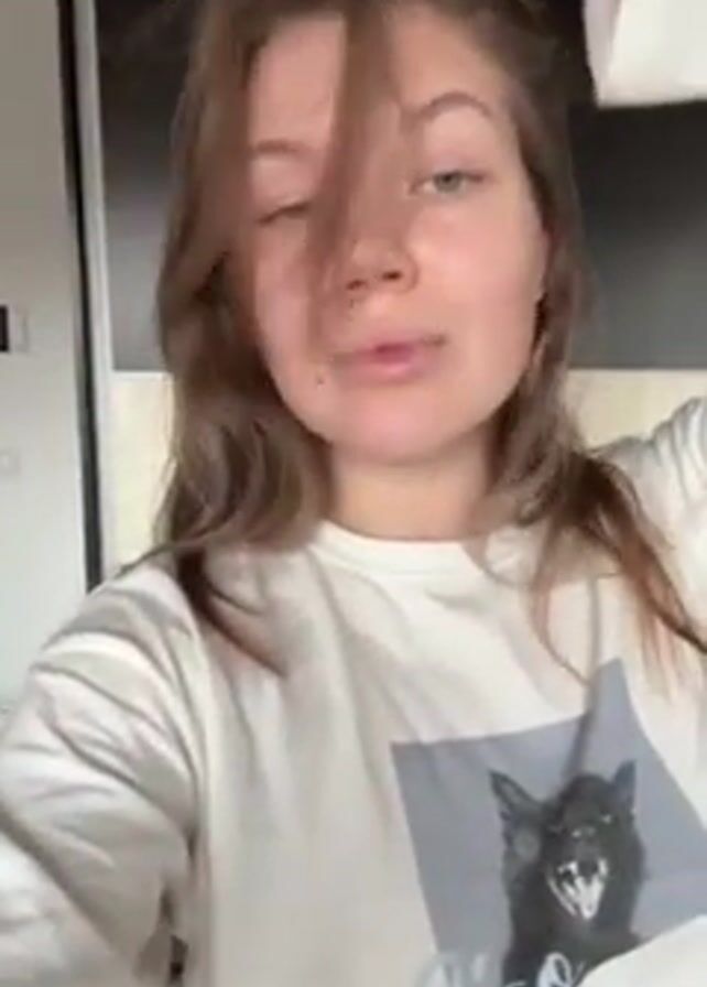 A young woman with light brown hair and green eyes is recording a video of herself indoors