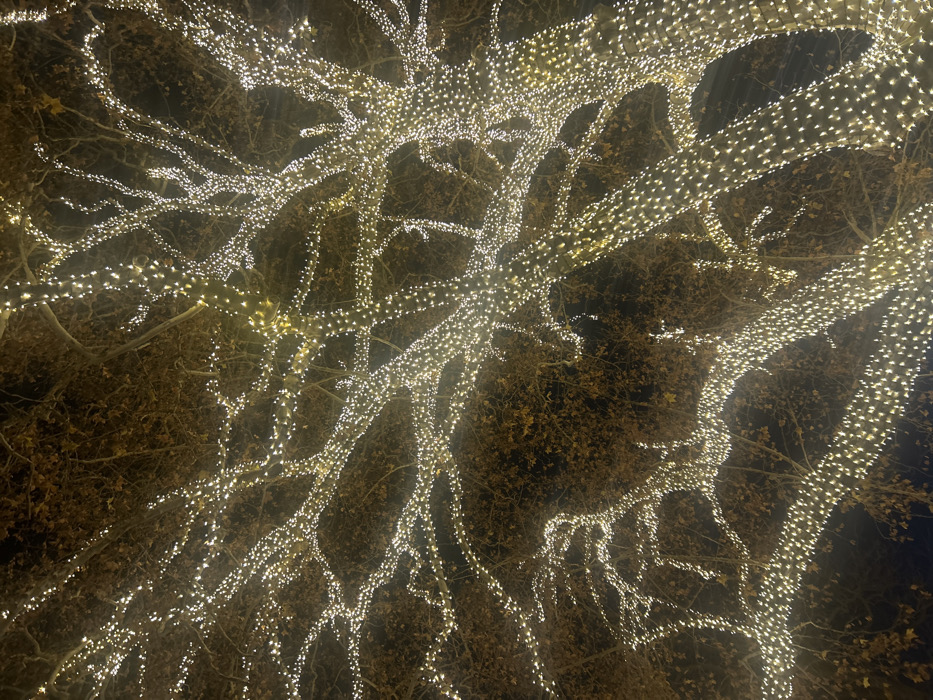 - "The scene displays a large deciduous tree at night, extensively illuminated by thousands of small, warm-white lights" by FM-JkXv43, licensed under CC BY 4.0