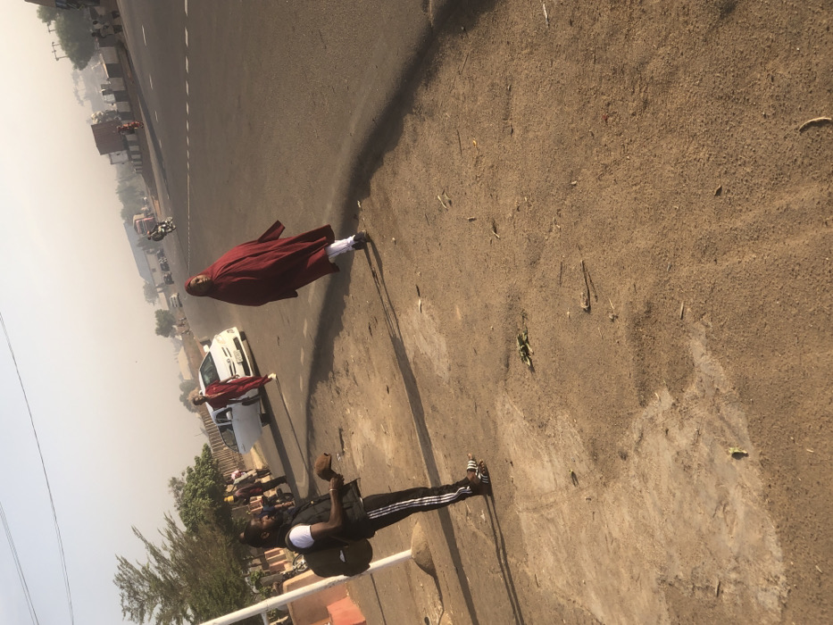 A man in black athletic wear stands on a weathered road, holding a dark object in his right hand. The road curves into the distance where another man, clad in a red robe, stands on the street. A white car sits nearby, and other people are seen in the background along with some vehicles. The day is hazy. The image appears to be taken at an angle.