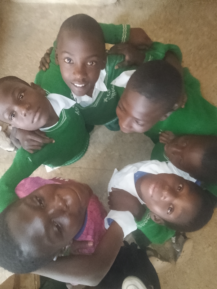 Six individuals, appearing to be children or young adolescents, are arranged in a close circular formation, looking upwards towards the camera. Five of the individuals are wearing green V-neck sweaters over white collared shirts, consistent with school uniforms. These sweaters feature green and white striped cuffs and indistinguishable white lettering or a logo on the left chest. One individual is wearing a pink short-sleeved top, and another wears a white collared shirt over a blue garment. Several individuals have their arms around others' shoulders or backs, suggesting a group pose or friendly interaction. The child at the top-center is smiling directly at the camera, while others display neutral or slightly smiling expressions. The environment consists of a uniform light brown or beige floor, indicating an indoor or sheltered outdoor setting. The lighting is even, without prominent shadows. While the individuals' attire suggests a school or educational context, the precise location within Jos, Nigeria, is not discernible from the visual information provided.