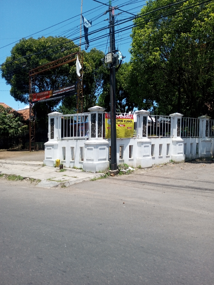 This image depicts a street scene, identified as being in the city of Tagtse Tashidingkha, Bhutan. In the foreground, an asphalt road occupies the lower portion of the frame, bordered by a concrete curb and sidewalk on the left and extending towards the mid-right. The midground features a white concrete fence with square pillars and vertical metal bars, enclosing an area behind it. A prominent yellow banner with red and black text, reading "TELAH DIBUKA! DAPUR KURNIA" and listing Indonesian cities such as "Medan," "Depok," "Bandung," "Bekasi," "Tangerang," "Bogor," and "Jakarta," is affixed to the fence. Directly in front of the fence, slightly left of center, stands a black utility pole supporting multiple overhead power lines and a grey utility box. A small black flag and a white flag are visible hanging from the power lines or associated rigging above the pole. In the background, to the left, a brown metal truss structure forms an archway or gateway, with a red banner hanging below it. The banner displays text including "PALMIA SUPER" in white letters. Large, dense green trees are visible behind the structures, and the sky above is clear and blue. No individuals or specific actions are visible within the frame.