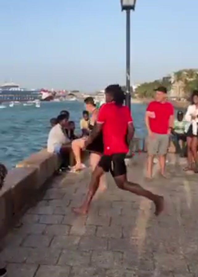 two people running toward a sea wall. One person, wearing a red and white shirt, picks up a flat, black object and jumps into the water, pulling a second person, wearing a black swimsuit, in with them. Several other people are present, either sitting on the wall or standing nearby, observing the action. Some are taking photos or videos with their phones. In the background, there's a body of water with several boats and a larger ship visible in the distance, under a clear sky. The immediate environment appears to be a paved waterfront area with palm trees.