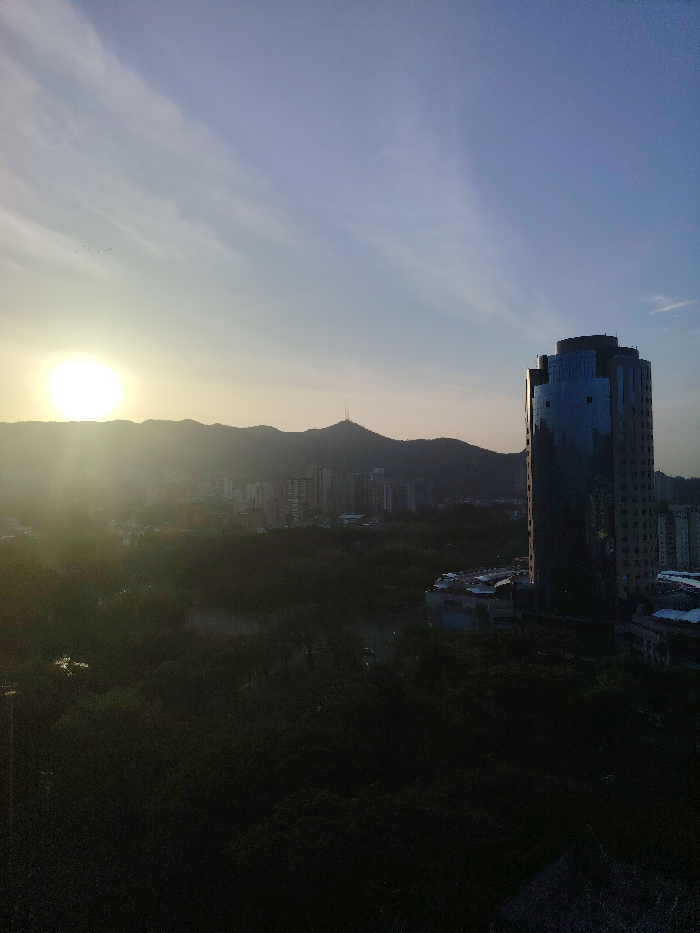 An elevated, wide-angle shot captures a cityscape at sunrise or sunset, looking toward the west or east over Valencia, Venezuela. The bright, circular sun is positioned low on the left horizon, casting a strong glare and backlighting the scene. A small flock of approximately seven dark birds is visible in flight in the upper left quadrant. The sky transitions from a brilliant yellow-white near the sun to a soft, light blue with wispy clouds across the upper right. A range of dark, undulating mountains forms the distant horizon, silhouetted against the bright sky. A prominent peak on the right side of the mountain range features a white communication tower on its summit. Below the mountains, a dense urban sprawl of multi-story buildings is visible, partially obscured by atmospheric haze and the intense light, appearing in subdued tones. In the right foreground, the Hesperia WTC Valencia Hotel, a tall, modern high-rise, dominates the view. It features a distinctive multi-tiered, somewhat cylindrical design with dark blue reflective glass facades, which reflect the sky. The base of this building includes a lower, multi-level structure with lighter-colored flat roofs. The immediate foreground, spanning the left and center portions of the image, consists of a dark, densely vegetated area, likely a park or forest, heavily shadowed and appearing almost black due to the lighting conditions. Faint reflections or artificial lights are discernible within this dark foliage, particularly on the left. No individuals are visibly present.