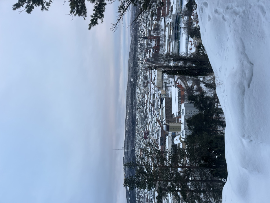 An elevated panoramic view captures the snow-covered cityscape of Sundsvall, Sweden, encompassing the Gustav Adolf District and beyond, under an overcast sky