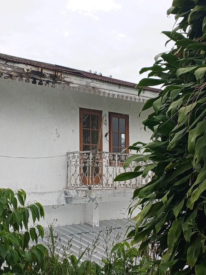 A dilapidated, two-story white building has a small balcony with an ornate, rusted railing. Two brown-framed windows open onto the balcony. The building's paint is peeling, and the roof's trim is decaying. A line of insulators sits atop the roofline. Green foliage partially obscures the view, both in the foreground and to the right side of the frame. The sky is overcast and gray.