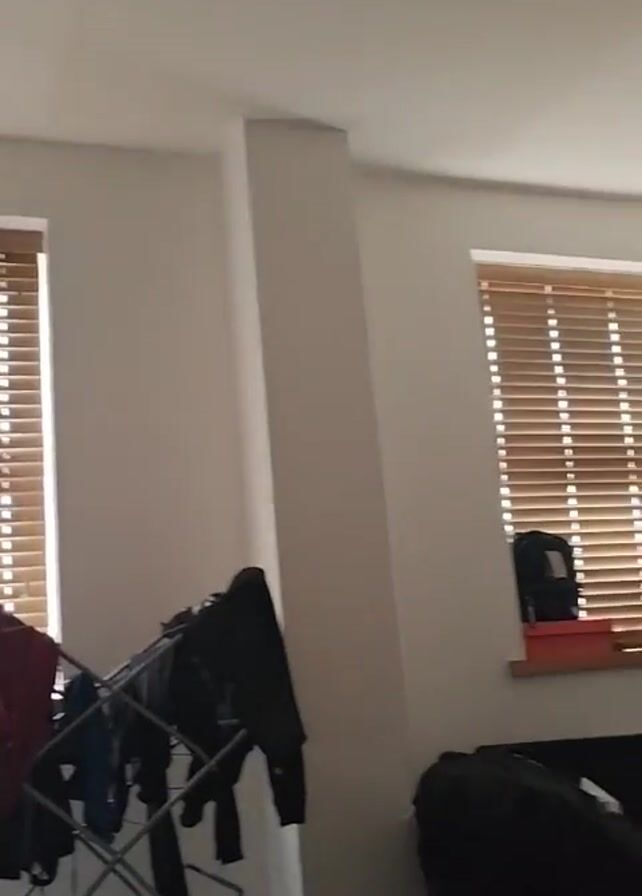 The camera pans from a drying rack covered in clothes to a view of a room. The room has white walls, a window with wooden blinds, a dark couch, and a light wood table with a water bottle on it. On the windowsill are a backpack, a red box, and a dark ball.