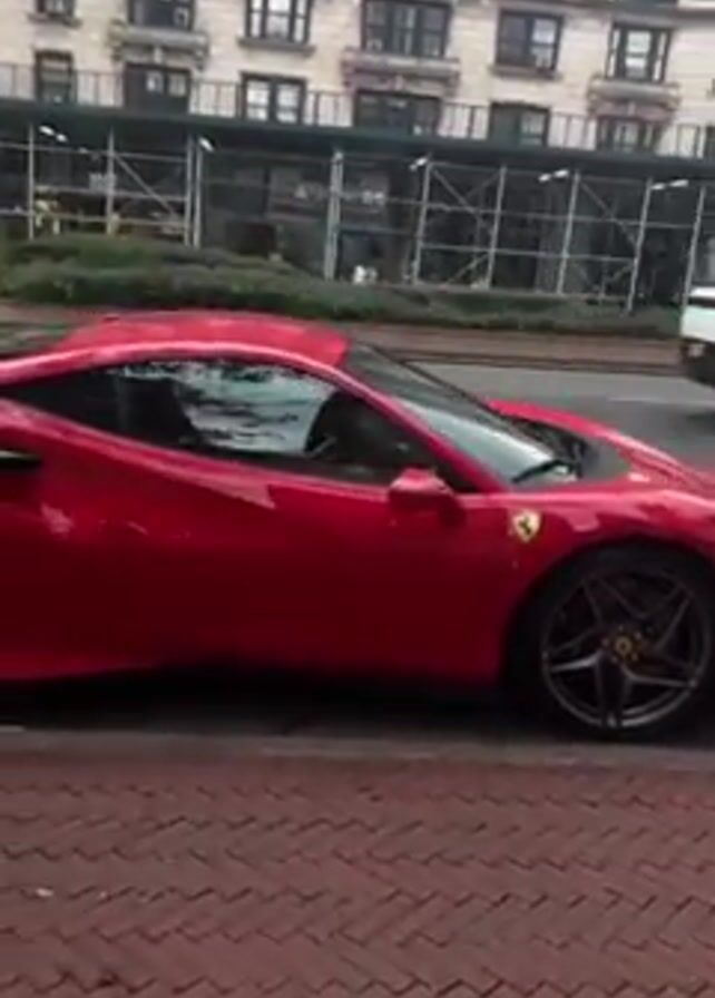 red Ferrari parked on a brick sidewalk next to a busy street. Buildings are in the background. As the camera pans, an Auntie Anne's pretzel truck pulls up and parks next to the sidewalk.