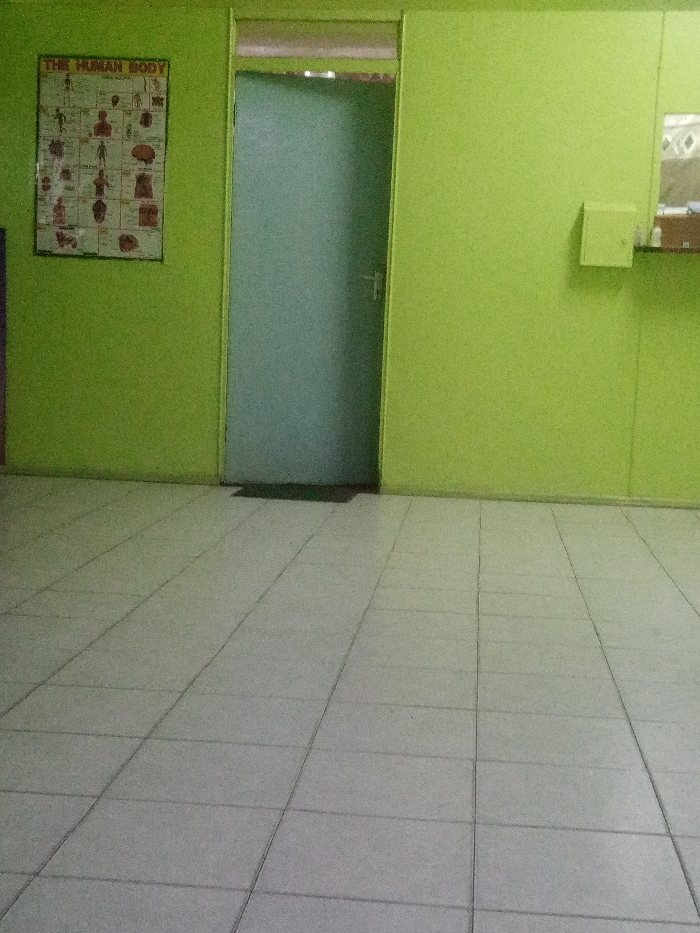 The image depicts the interior of a room, likely a medical facility or office waiting area, located in Majengo ward, Kenya. The walls are uniformly painted a bright lime green. The floor is covered with light grey square tiles laid in a consistent grid pattern. Centrally positioned on the rear wall is a closed, light blue-green door, which appears to be made of frosted glass or a similar opaque material. The door has a silver-colored horizontal handle. A dark, rectangular doormat is situated directly in front of the door at floor level. Above the door, a narrow transom window provides a glimpse of an adjacent, slightly lighter area. On the left green wall, a white poster titled "THE HUMAN BODY" is affixed. This poster displays various anatomical diagrams of human organs and systems. On the right green wall, a small, square, light green wall-mounted cabinet or box is visible. To the right of this cabinet, a reflective surface, possibly a mirror or tiled section with a diamond pattern, is situated above what appears to be a counter or shelf. No individuals are present within the scene, and no actions or interactions are depicted. The environment appears clean and well-lit.