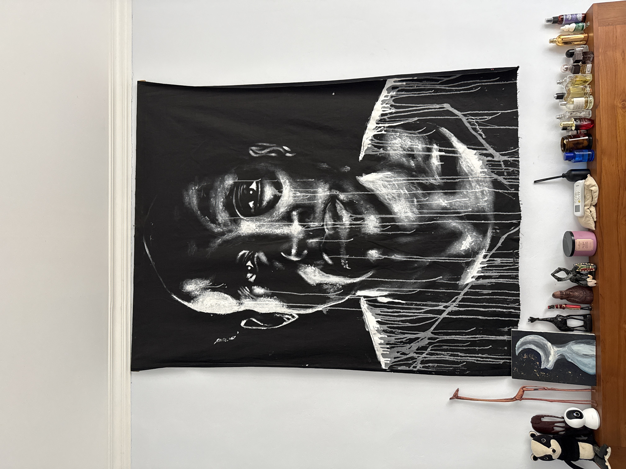 A medium shot captures a black and white artistic portrait hanging on a white wall next to a dark wood cabinet. The portrait, rendered in stark black and white, features a person's face with white streaks accentuating certain features. The portrait is rotated counterclockwise. To the right of the portrait, a dark wood cabinet is partially visible, featuring a collection of small items attached to the wall: assorted bottles, a remote control, a candle, and various decorative objects, including figurines and a small painting. The setting is presumed to be indoors. There is no clear evidence in the image to identify the location in Tampaksiring, Indonesia.