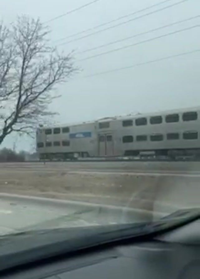 Metra commuter train passing on a gray day. The video is filmed from inside a car. The train is silver and blue, and runs parallel to the road. Trees with bare branches are on the side of the road. Power lines run overhead. The weather appears to be wet.