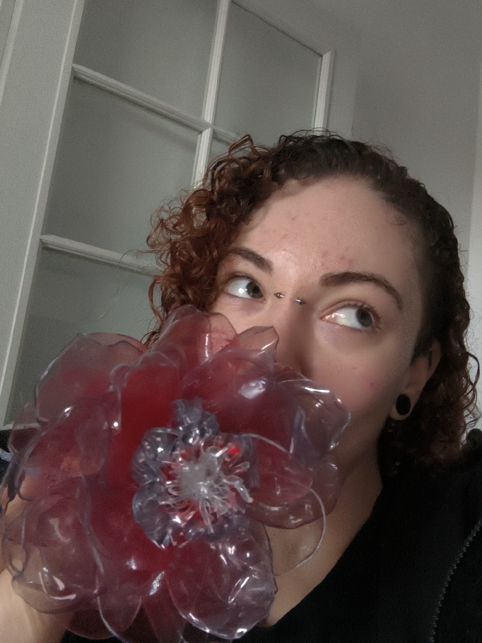A close-up photograph, taken indoors in the city of Unknown, Unknown, depicts an individual with light brown curly hair, light-colored eyes, a bridge piercing, and a black ear gauge in the right ear. The individual is wearing a dark, possibly zippered, garment. A large, translucent plastic flower, predominantly reddish-purple with a clear central structure, is held in front of the lower half of the individual's face. The individual's gaze is directed upwards and to the left. The background features a white-framed interior door or partition composed of multiple translucent glass panels.