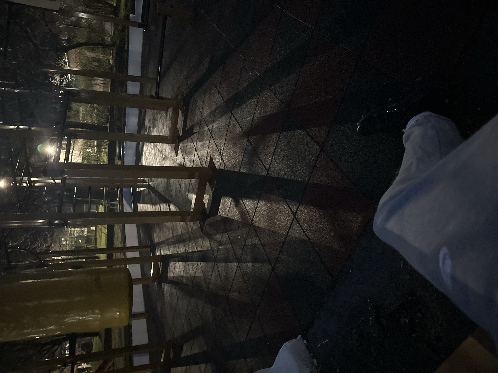 nighttime view in Sopot, Bulgaria, featuring outdoor exercise equipment on a rubber-tiled surface. Shadows from the equipment are cast across the ground. A person is partially visible in the bottom right corner, wearing white pants and black shoes. The environment appears to be a park or public space.