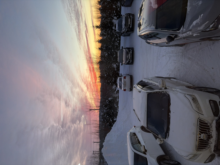 - "The image displays an outdoor parking area in Chaikovsky, Russia, during either sunrise or sunset, under a sky exhibiting vivid red, orange, pink, and light blue hues with visible cloud patterns and a faint contrail" by FM-rbhEP2, licensed under CC BY 4.0