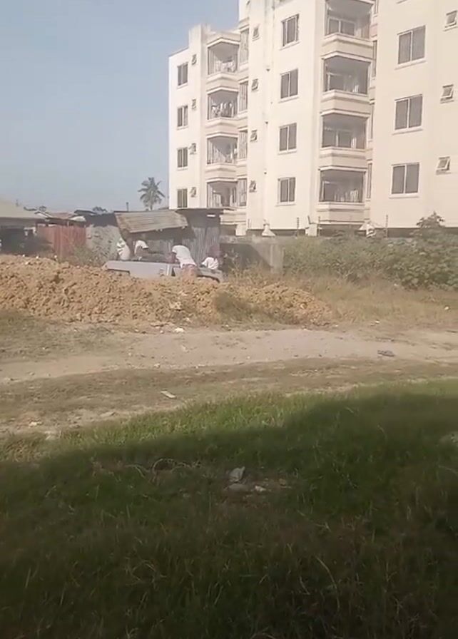 dirt lot with a pile of dirt in the center. Behind the dirt pile is a shanty structure. Several people are moving around inside and in front of the shanty. A tall, white apartment building with balconies is in the background. In the foreground is a patch of green grass, partly in shadow. The sky is clear and hazy.