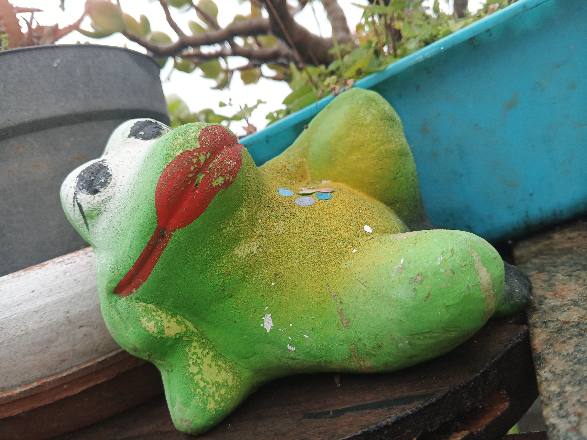 - "The image features a green ceramic frog figurine with red accents and black-and-white eyes, positioned on a wooden surface" by FM-3PJkr1, licensed under CC BY 4.0