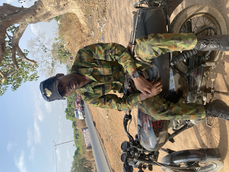 - "A Nigerian Army soldier sits astride a black motorcycle on a dirt shoulder beside a paved road in Zaki Biam, Nigeria" by FM-Ff9pr2, licensed under CC BY 4.0