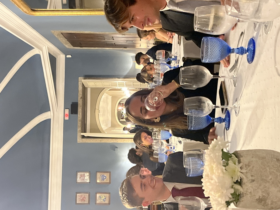 People are sitting at a long table set for a formal event. Several wine glasses, some clear and some blue, are placed in front of each person. A woman in the center is holding a wine glass to her eye. A man to her left is smiling. A floral centerpiece is at the edge of the table. The room is decorated with blue walls, white trim, and several framed pictures. A mirror on the wall gives the illusion of a hallway.