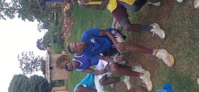 Several people are gathered outdoors on grassy terrain. One man wears a blue T-shirt and black shorts. Another man has on a blue and white jersey and white shorts. All are wearing sneakers. In the background are trees and small brick buildings.
