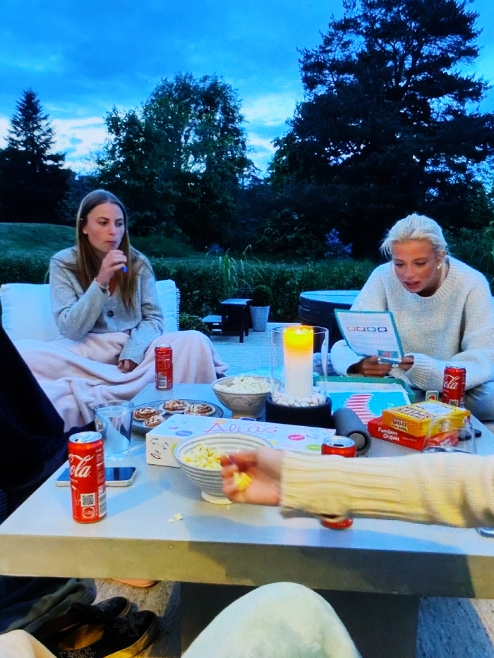 The image depicts an outdoor evening scene on a patio or terrace in Otta, Norway, featuring three individuals gathered around a light grey rectangular table. The sky is a deep blue, indicative of twilight or night, with dense green foliage and trees silhouetted in the background. To the left, a female with light brown hair, wearing a grey cardigan and wrapped in a pink blanket, is seated on a white outdoor sofa, holding a light blue and white electronic vaping device to her mouth. On the right, a blonde female wearing a light grey knitted sweater is seated opposite, leaning forward and intently observing a white rectangular card with blue-green markings. A third person, partially visible in the bottom right foreground, wears a light-colored long-sleeved top and holds popcorn in their hand, reaching into a bowl. Dark-colored shoes are visible beneath the table. The table is laden with multiple items: two red Coca-Cola cans, a transparent glass of water, a white smartphone, a plate containing four small pastries, two bowls filled with popcorn, a white box labeled "Alias," and a red box labeled "Familjespelet Original" (Family Game Original). A glass lantern with a white base and internal white stones holds a lit yellow candle, providing illumination. A grey cylindrical object is also present on the table. In the midground, a dark outdoor hot tub is partially visible behind the right individual, alongside various outdoor plants and elements.