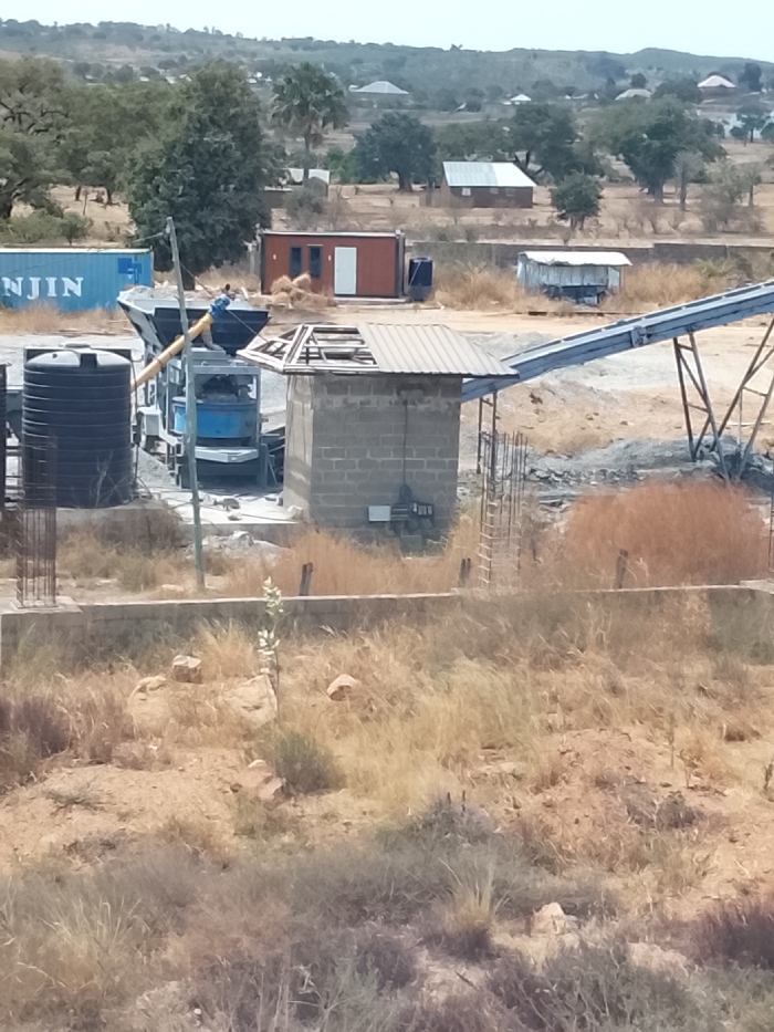 The image depicts an industrial and residential landscape in Jos, Nigeria, under clear, bright conditions. In the foreground, the terrain is dry and uneven, characterized by sparse, yellow-brown grass and scattered rocks. A low, concrete block wall, likely a foundation, runs horizontally, with several vertical rebar structures indicating ongoing construction. The midground is dominated by an operational aggregate processing or concrete batching facility. A large, dark cylindrical water tank stands on the left. Adjacent to it is a blue and grey machinery assembly, possibly a concrete mixer or crusher, with a yellow auger extending from its side. A person wearing a blue shirt is visible near the upper section of this machinery. To the right, a grey concrete block building features a partially installed corrugated metal roof, revealing exposed structural members where panels are missing. Electrical conduit is visible on its exterior. An inclined metal conveyor belt structure extends from this area towards the right, leading to piles of crushed aggregate material. Further back, a blue shipping container, partially visible with the text "NJIN," is situated near a red portable office unit that has a white door and two small windows. A smaller, dilapidated structure is visible behind the red container. The background shows scattered residential buildings with light-colored roofs, interspersed among trees and dry vegetation, consistent with a semi-rural or developing urban periphery. Distant hills or elevated terrain are visible on the horizon under a hazy sky. The overall scene indicates active industrial operations, likely construction-related, situated adjacent to a residential zone in a dry environment.