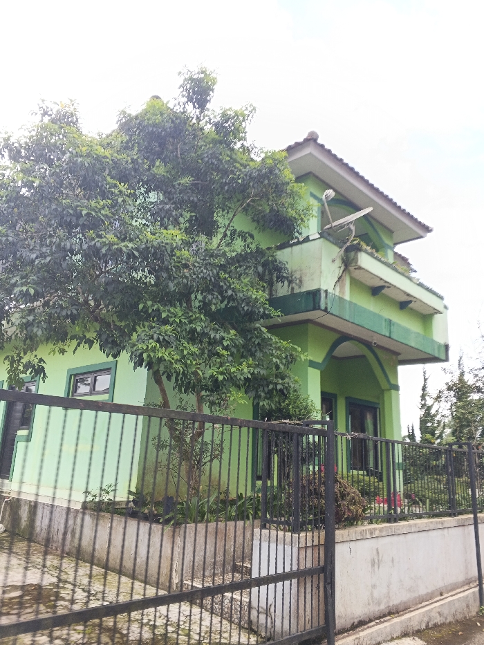 The image displays a two-story residential building, painted light green with darker green trim, situated in an unknown city in Cambodia