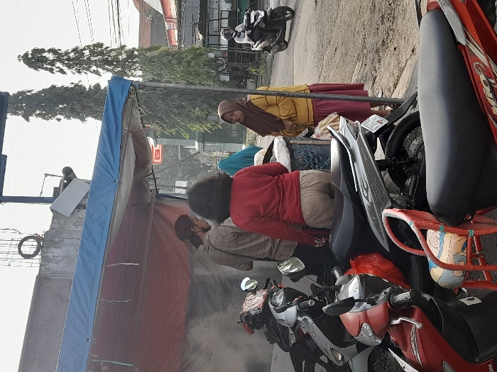A group of individuals are standing next to a food stall covered by a blue tarp. They appear to be ordering or purchasing food. Several motorcycles are parked in front of the stall, partially obscuring the view. One woman is wearing a brown headscarf and a yellow shirt, another is wearing a red shirt, and a man is wearing a plaid shirt and brown head covering. The scene takes place outdoors, possibly on a street or sidewalk.