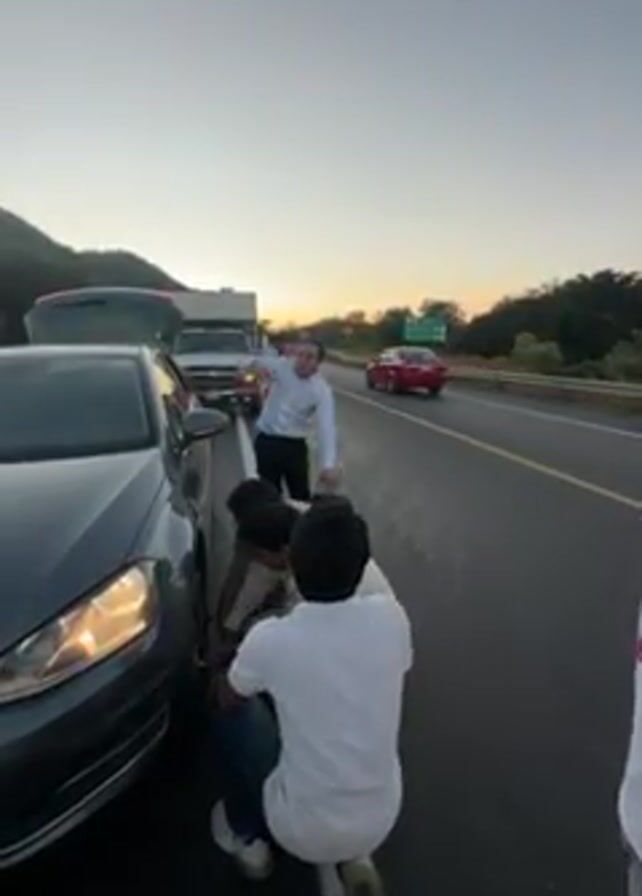 four men on the shoulder of a highway working on changing a flat tire on a gray car