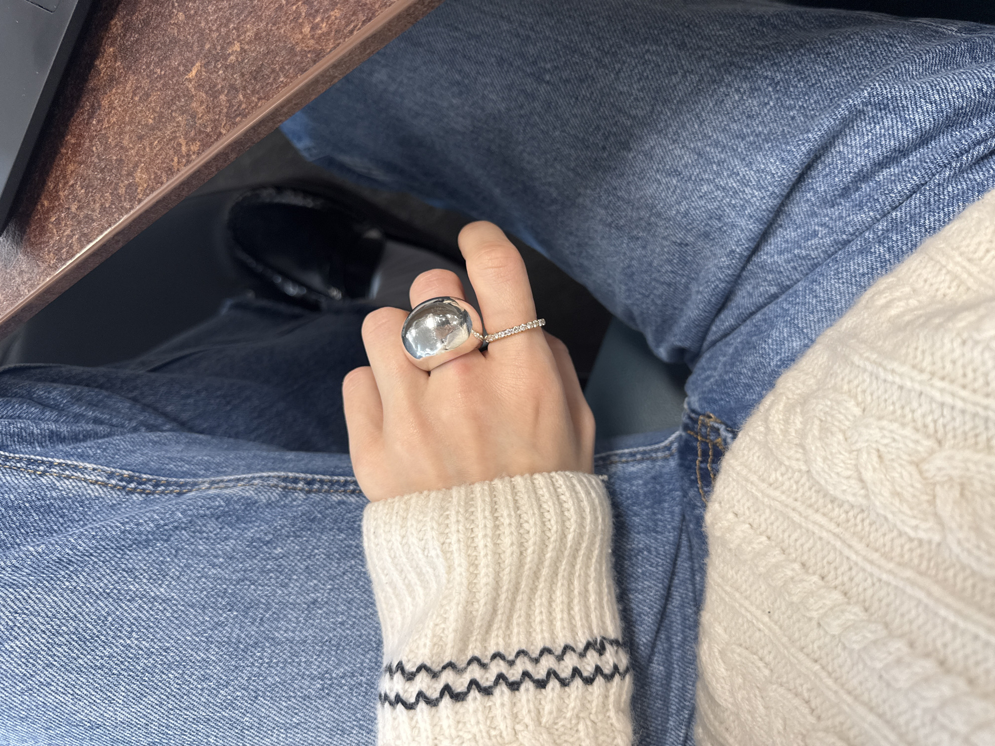 The image captures a partial view of an individual seated indoors, identified as being within the city of London, United Kingdom. The subject's left hand is centrally positioned, resting on their lap, revealing a light skin tone. On the ring finger, two rings are present: a prominent, polished, silver-toned dome-shaped ring and a slender, silver-toned band encrusted with small, clear stones. The individual wears light blue denim jeans and an off-white cable-knit sweater. The visible sweater cuff is ribbed and features a dark, wavy stripe pattern. To the upper right, a dark brown, speckled surface, likely a table, is partially visible, with a black object, consistent with a laptop edge, resting upon it. In the lower right background, a dark, reflective shoe is partially observable.