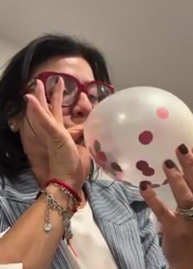 A woman with dark hair and red-framed glasses is blowing up a clear balloon with red and black confetti inside. She is wearing a white top and a blue striped jacket, with jewelry on her left wrist and rings on her fingers. The background is a plain, light-colored wall. The camera angle is slightly low, looking up at the woman.
