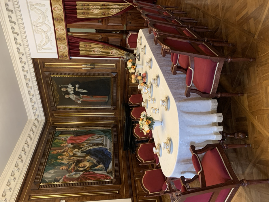 This image depicts a formal dining room within the Nesvizh Castle complex in Nyasvizh, Belarus