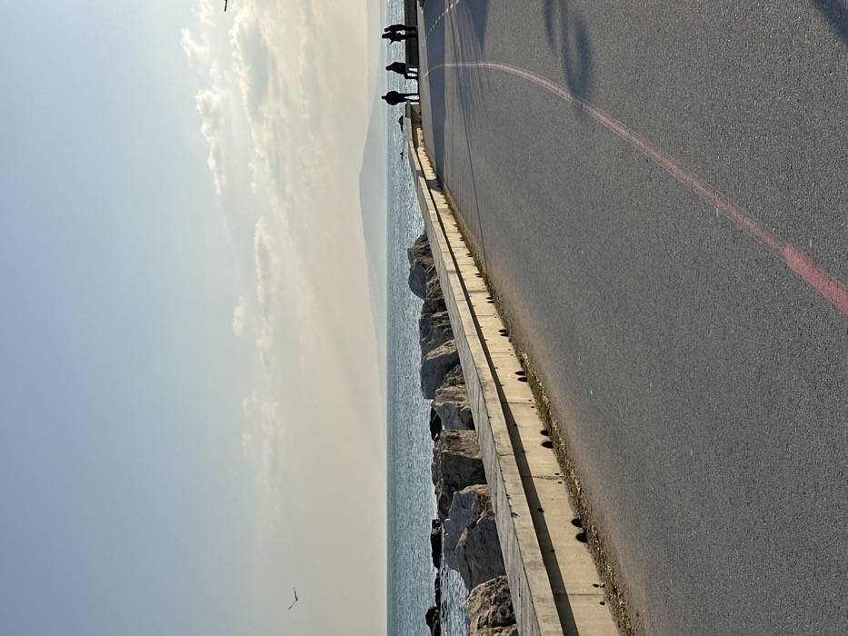 The image captures a coastal scene in Balchik, Bulgaria, under a clear to partly cloudy sky. In the foreground, an asphalt pathway or road extends from the bottom of the frame, curving gently towards the right and receding into the mid-ground. A faded, thin red line is visible painted longitudinally on the asphalt surface. To the left of this pathway, a concrete seawall with a flat top runs parallel to the shore. The seawall features a series of uniformly spaced, dark circular openings along its base. Beyond the seawall, a natural rock barrier composed of large, light-colored boulders borders the tranquil, blue-green sea. The sea stretches to a distant, low-lying landmass visible as a hazy silhouette on the horizon. In the mid-ground, positioned on or immediately adjacent to the seawall on the right side of the image, four human figures are observed. They are rendered in silhouette against the brighter sea and sky. One figure appears to be seated, while the other three stand in close proximity to each other, all facing towards the sea. In the upper-left quadrant of the sky, a single bird is captured in flight. Long shadows extend across the pathway from the right side, indicating a low sun angle.