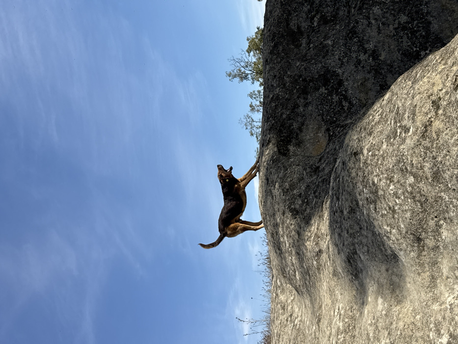 - "The image depicts a medium-sized dog with a dark brown and tan coat, featuring a yellow ear tag in its left ear, standing in a full-body stretch on a textured, light-colored rock formation in Kvakhvreli, Georgia" by FM-3fp6q1, licensed under CC BY 4.0
