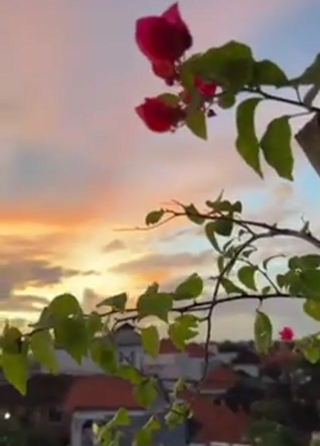 The video displays a close-up view of a pink bougainvillea plant against a vibrant sunset sky
