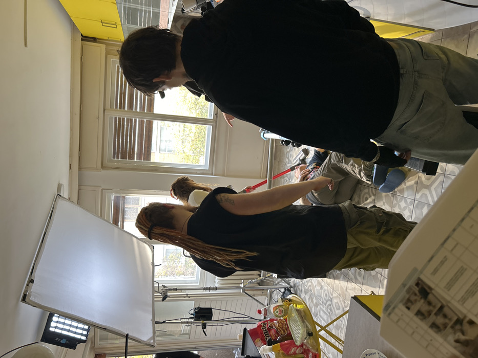 The image depicts an indoor scene in the Vozdovac Urban Municipality, Serbia, resembling a residential room, possibly a kitchen or utility area, configured for a film or photography shoot. The floor is tiled with a geometric pattern in shades of grey and white. Three large windows on the far wall feature partial Venetian blinds and offer a view of exterior trees and another building. Four individuals are present. In the left foreground, a person with long, light brown dreadlocks, wearing a black sleeveless shirt and olive green cargo pants, stands facing away from the camera. A tattoo is visible on their left bicep. To their right, another individual with short dark hair, wearing a black hooded sweatshirt and light-colored jeans, also stands facing away, with their right arm slightly extended forward. In the bottom left corner, a document displaying multiple small images and text is partially visible, held by an unseen hand. Near the center of the frame, behind the dreadlocked individual, another person with long, brown, wavy hair, clad in a light-colored top, holds a red-handled object, possibly a mop or broom, directed downwards. On the tiled floor, a fourth individual lies supine, wearing a dark t-shirt and light pants, with their eyes closed. A silver-colored object, consistent with a vacuum cleaner head, rests near their head. To the far left, professional lighting equipment is set up, comprising an LED panel light illuminating a large rectangular softbox diffuser, mounted on a stand. Adjacent to the lighting, on a small, round yellow metal table, are several items including a red packet labeled "Smoki," a yellow bottle of "Fairy" dish soap, a white bottle, and a clear container with a green lid. Yellow wall-mounted cabinets are visible along the right wall. The overall arrangement suggests a staged event or production.