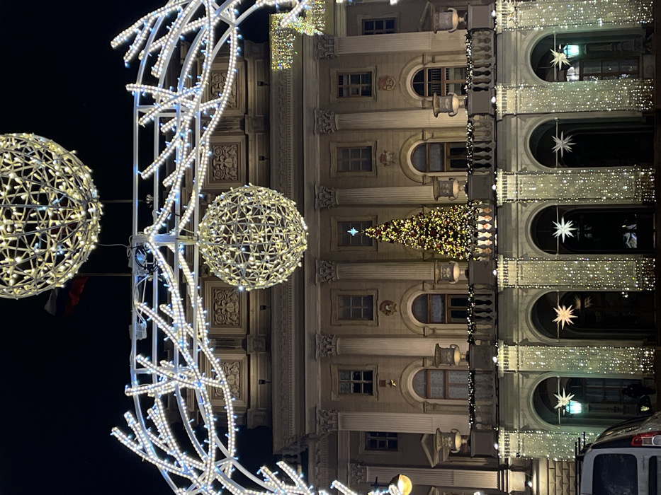 A building with columns and arches is decorated with Christmas lights. A decorated Christmas tree stands tall between the windows. Glowing stars and strands of lights adorn the arches. In the foreground, illuminated white spheres hang from a lit-up archway, creating a festive atmosphere. A vehicle is visible on the right side of the image.