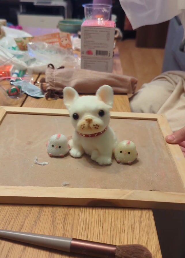 A person is dusting a brown board with a white figurine of a French bulldog sitting between two white chick figurines on it