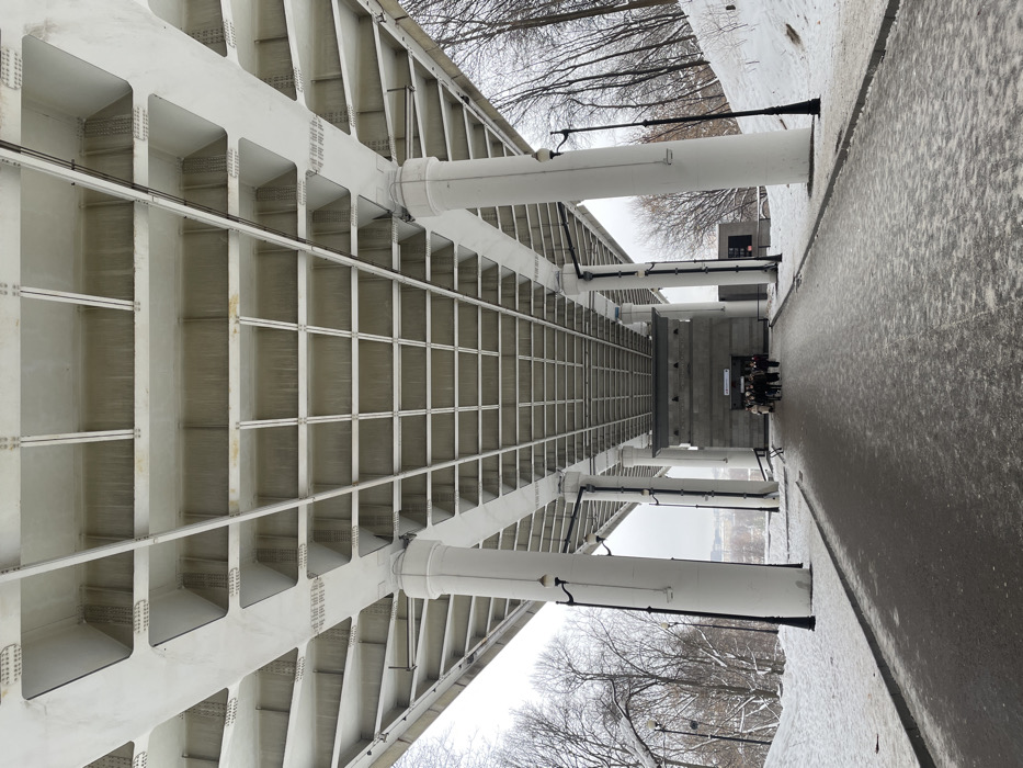 This image depicts the lower level of the Vorobyovy Gory (Sparrow Hills) Metro Bridge, also known as the Luzhniki Metro Bridge, located in Moscow, Russia. The view is from a pedestrian pathway looking forward and slightly upwards beneath the bridge's structure during winter conditions. The scene is dominated by the colossal underside of the bridge, forming a long, covered corridor. Its ceiling consists of a grid-like pattern of light-colored, possibly concrete or painted metal, beams and coffers. This structure is supported by multiple rows of thick, cylindrical white pillars that extend upwards from the ground. Black, ornamental lampposts with white globe lights are affixed to some of these pillars or stand independently along the walkway. The pedestrian path is paved with asphalt, partially covered by compacted snow and ice, exhibiting a mottled dark grey and white appearance. In the middle distance, a group of approximately 10-15 individuals, dressed in winter coats, are gathered near the entrance to what appears to be a building or tunnel integrated into the bridge's base; this is the lower entrance to the Vorobyovy Gory metro station. The structure around the entrance is clad in grey, possibly stone or concrete panels, with a sign visible above the opening. On both sides of the pathway, the ground slopes upwards, covered in fresh snow. Numerous bare deciduous trees with dark branches are visible on these snow-covered slopes, indicating a winter season. The sky is overcast, contributing to diffuse lighting. A faint, hazy outline of distant city structures can be discerned beyond the bridge's span in the far background.