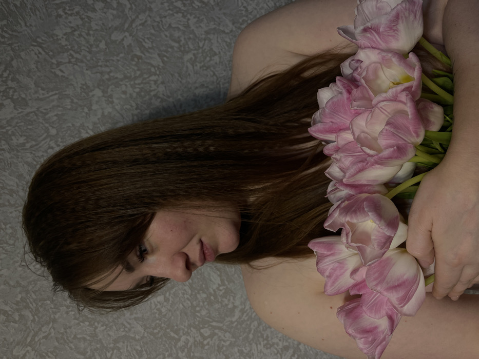A mid-shot photograph shows a single adult female against a textured, light gray wall, indicative of an indoor setting. She has long, crimped, brown hair with bangs, falling over her bare shoulders. Her head is turned slightly to the left, and her gaze is directed downwards. Both hands are visible at the bottom, holding a bouquet of approximately ten pink and white variegated tulips. The tulips display petals that are slightly open or drooping, suggesting they are past their freshest state. No specific geographical markers or contextual elements are discernible in the image to identify a precise location within the city of Chaikovsky, Russia.