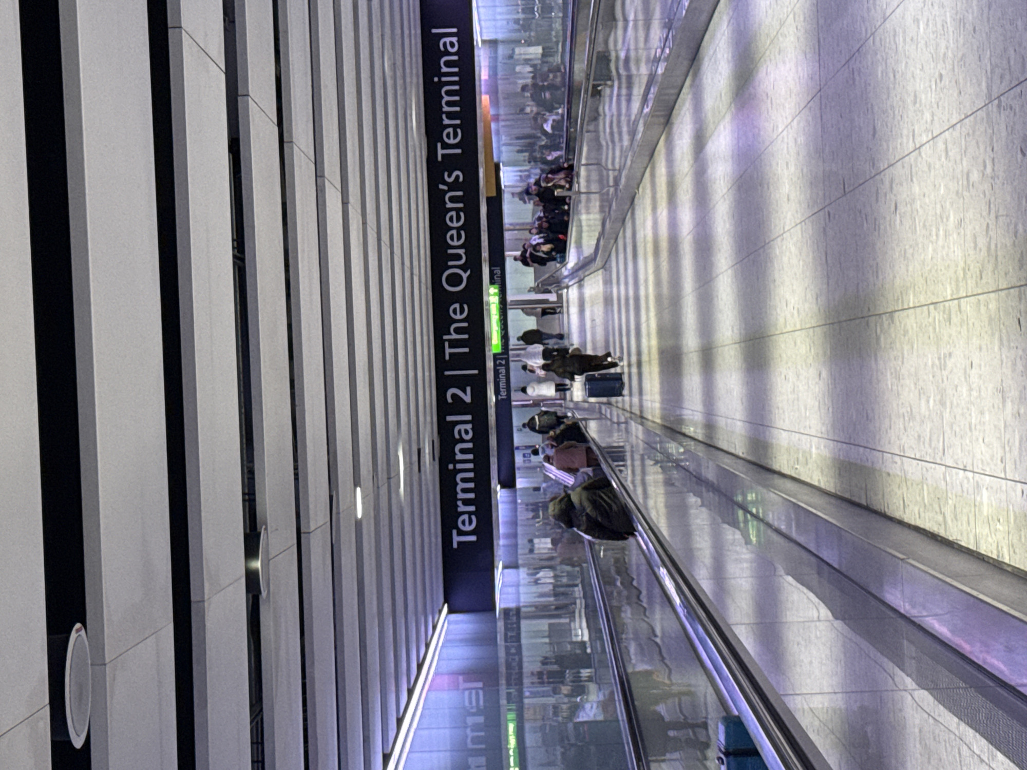 n interior shot of Heathrow Airport, London, United Kingdom, featuring a moving walkway with passengers. The sign overhead reads "Terminal 2 | The Queen's Terminal." The background consists of vertical white panels, and the walkway surface is light gray. People with luggage are visible on the moving walkway.