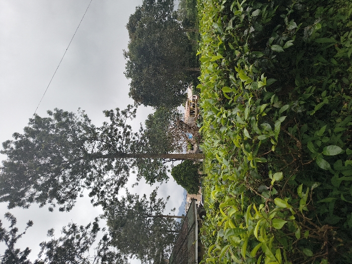 The scene depicts an outdoor environment in An Khe Ward, Vietnam, under an overcast sky. The foreground is dominated by dense, vibrant green foliage, likely cultivated shrubs or tea bushes, extending across the lower half of the frame. In the midground, several tall, slender trees with full canopies rise above the foliage. To the far left, partially obscured by trees, a building with a dark, sloped roof is visible. Further into the midground and right of center, additional structures, including a multi-story building with lighter-colored walls, are discernible amidst scattered trees. The background features a light grey, uniformly cloudy sky. A thin, dark utility wire or cable traverses the upper right quadrant of the sky horizontally. No individuals or active interactions are present within the frame.