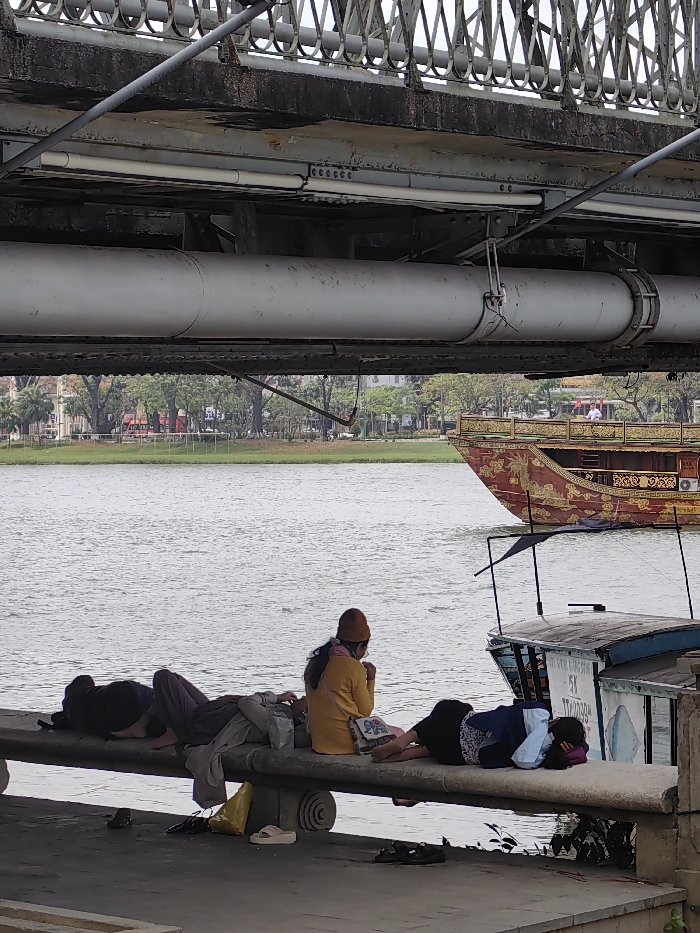 The image displays a daytime scene under the Tràng Tiền Bridge along the Perfume River in Phú Xuân Ward, Huế, Vietnam. The underside of the bridge structure dominates the upper frame, revealing steel trusswork, concrete elements, and a prominent grey cylindrical pipeline running horizontally. Below this, a grey concrete promenade features a continuous bench or ledge bordering the river. Three individuals are present on this bench. On the left, one person lies on their left side, facing away from the camera, dressed in dark attire. Next to them on the ground is a yellow plastic bag, a pair of white slip-on sandals, and a pair of black sandals. In the center, a person sits upright, facing away from the camera towards the river, wearing a yellow long-sleeved top and a brown beanie. A light-colored patterned bag rests beside them. On the right, a third person lies prone on the bench, head resting on their left arm, wearing a dark top and patterned bottoms. A pair of dark shoes is on the ground near this individual. The Perfume River occupies the mid-ground, showing choppy grey water. On the far bank, green trees and distant buildings are visible. On the river itself, a large, ornate red dragon boat with gold and black decorative patterns is positioned to the right, with its bow and a person in a white shirt on the upper deck visible. Partially obscuring the lower right, a smaller blue and white utility-style boat, bearing the number '51' on its side and equipped with a dark canopy, is also present.