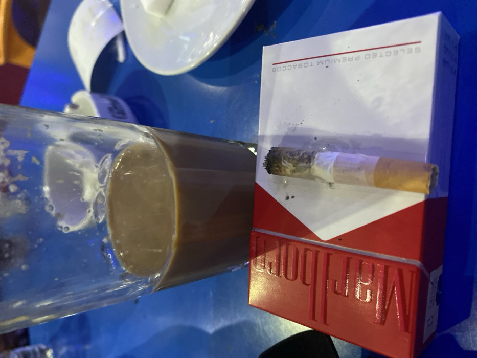 The image depicts a lit cigarette resting on a red and white Marlboro cigarette pack. Beside it, a glass filled with a brown liquid, possibly chocolate milk or coffee, is seen lying horizontally. Above, a white saucer and cup are present, seemingly part of a coffee set. The scene is set on a blue surface, possibly a table.