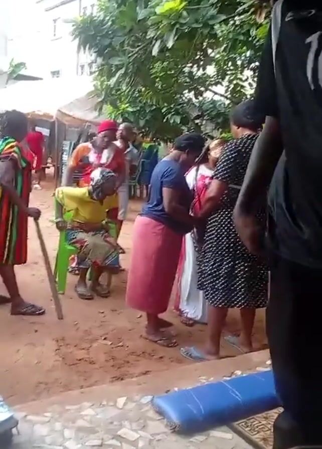 gathering of people in what appears to be an outdoor event or celebration. Several women, some wearing colorful clothing, stand around an elderly woman seated on a green plastic chair and holding a cane. Behind them, other people are visible, including a man in a red and yellow outfit. The ground is sandy. A person wearing a black shirt with the number 16 on it stands partially in the foreground, obstructing part of the view. In front of them, there are several drums. The sound of drumming is audible.