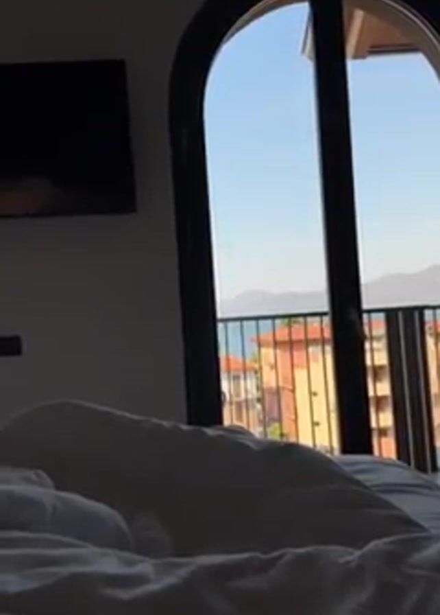 The scene is an interior shot of a bedroom with a rumpled white bed in the foreground. In the background, a large arched window or door leads to a balcony. The view from the balcony includes buildings with red roofs, a body of water, and distant mountains under a clear blue sky. A large black television screen is mounted on the wall to the left of the window. The room appears dimly lit, casting shadows on the bed and the wall. The camera slowly pans across the room.
